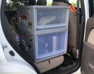 The water jugs go in the floor behind the drivers seat so I can easily get to them. I carry all the cooking stuff & whatever food I bring & buy in two storage drawers behind the passenger seat. The bottom drawer holds all my ‘equipment’ & the top drawer holds food, spices, etc.