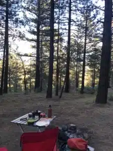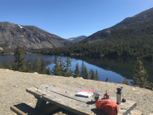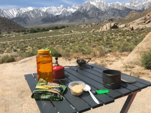 When it’s time to cook something, I set up my table & backpacking stove & get it done. I do love to sit outside & eat….most of the time at camp I’m in a lovely forest or have awesome views & that’s the best part of eating in camp.